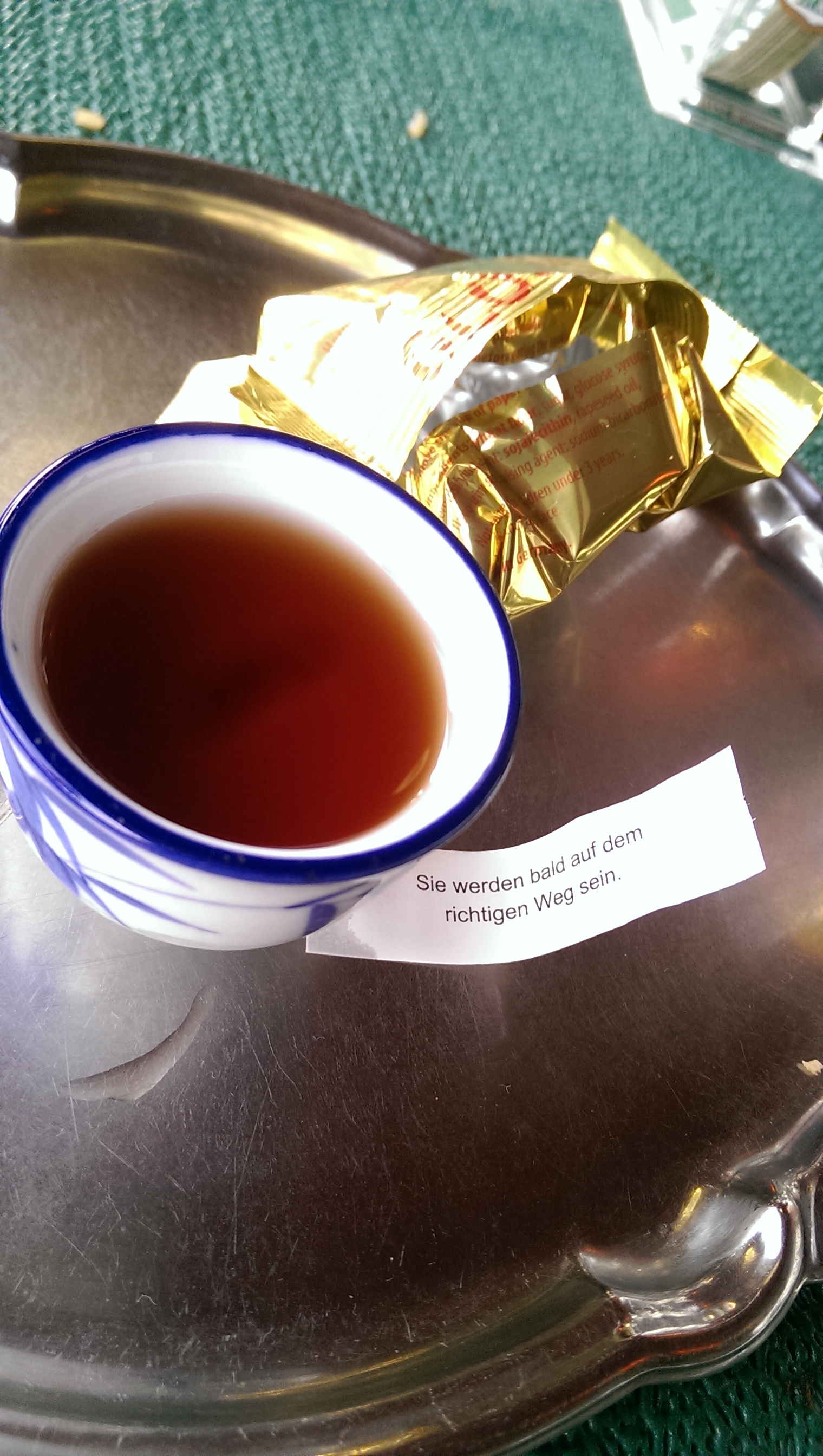 Da das Gasthaus Ruhetag hat, muss ich mir eine andere Lokalität für mein Abendessen suchen und lande mangels Alternativen beim Chinesen. Das Essen ist nicht so toll, dafür aber der Inhalt meines Glückskekses: Sie werden bald auf dem richtigen Weg sein! Das zweite gute Omen (nach der Nonne im Bus) auf meiner Reise.