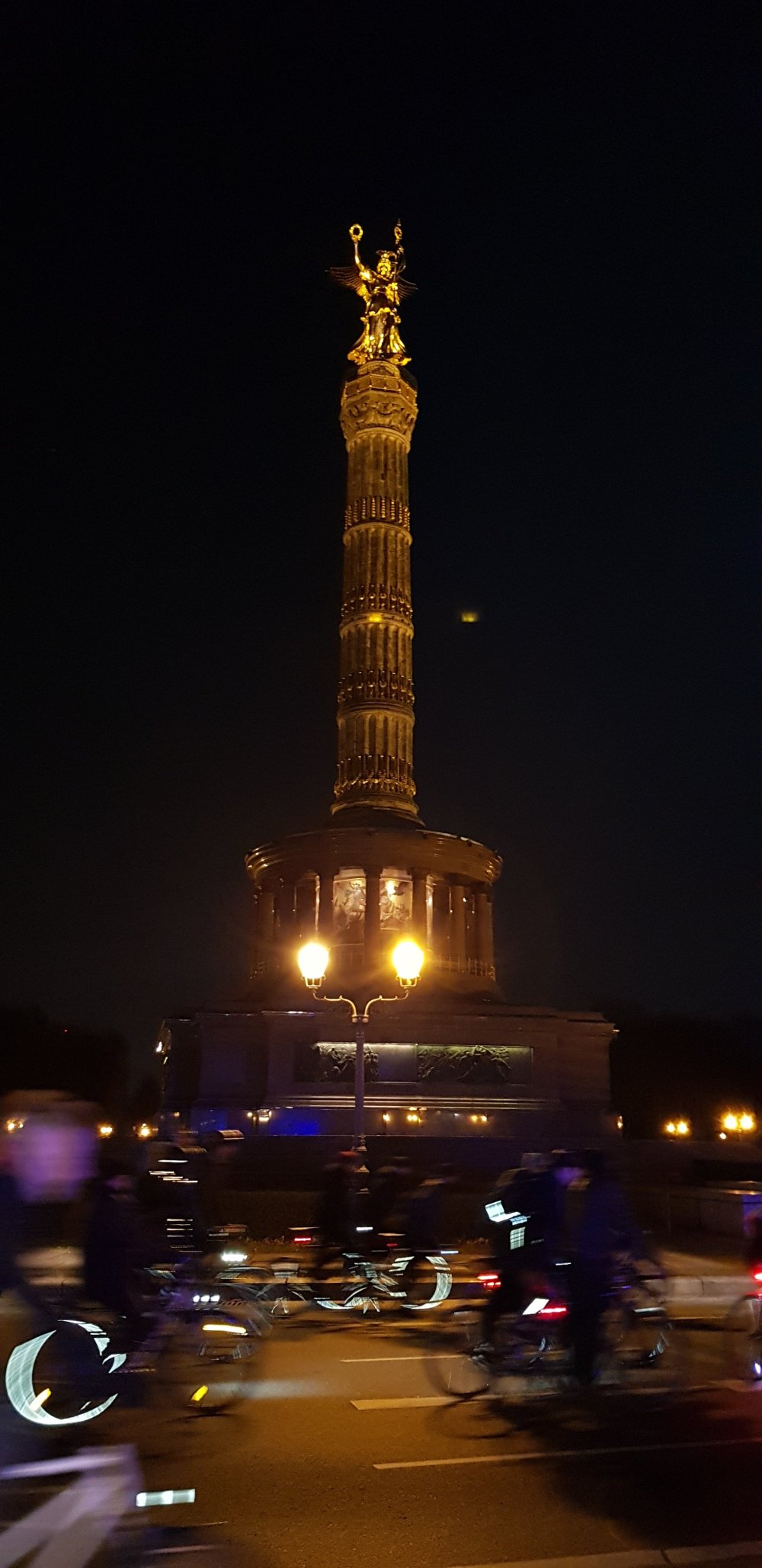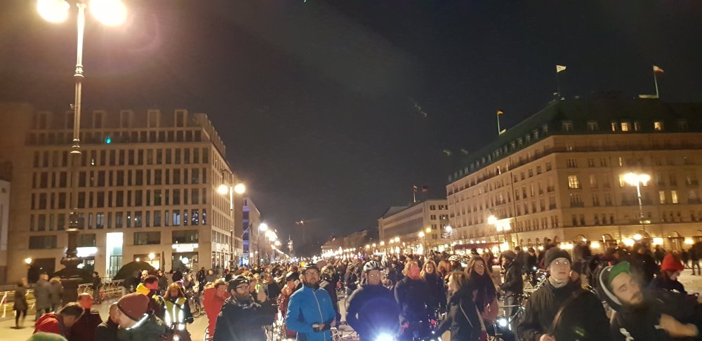 Zur Zeit komme ich nicht wirklich dazu, Touren am Wochenende zu unternehmen, da kommt die critical mass gerade recht. Für alle, die noch nie davon gehört haben, es handelt sich um eine Fahrrademo, die regelmäßig einmal im Monat in verschiedenen Städten stattfindet. Man sammelt sich und wer vorne fährt, darf bestimmen, wo die “Masse“ hinfährt. Und da Radfahrer ab 15 als ein geschlossener Verband gelten, darf die Ampel auch noch überfahren werden, wenn sie schon auf Rot gesprungen ist. Je mehr Fahrer, desto länger der geschlossene Verband, desto länger müssen die Autofahrer einmal warten. Da hat nicht jeder für Verständnis. In Kreuzberg weniger als in Charlottenburg. Wir kommen zu spät am Treffpunkt an, sehen aber noch die blauen Polizeilichter, die den Konvoi nach hinten absichern. Weiter geht es durch Berlin, Prenzlauer Berg, Brandenburger Tor, Siegessäule, Charlottenburg und zurück. Es ist eher eine Party, viele Räder sind mit Boxen bestückt und man kann sich für unterschiedliche “floors“ mit unterschiedlichen Musikstilen entscheiden, je nachdem, wo man fährt. Und es macht trotz der kalten Temperaturen einfach riesigen Spaß durch die Straßen zu fahren, ohne Autoverkehr. Viele Räder sind mit Lichtern geschmückt und alle sind gut drauf. Wie heißt der Slogan aus der Autowerbung: “Freude am Fahren“. Passt!