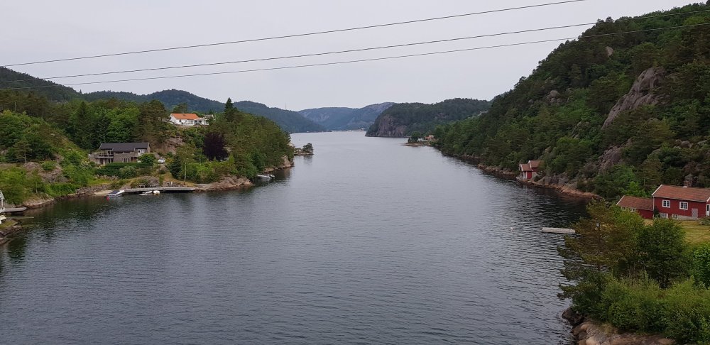 Morgens muss ich erstmal die etlichen Höhenmeter hochklettern, direkt nach dem Frühstück eine schweißtreibende Angelegenheit. Dafür ist dann aber auch der Weg umso schöner. Nachdem man die Hauptstraße verlassen hat, gibt es kaum Verkehr aber immer wieder grandiose An- und Ausblicke. Ich fühle mich heute emotional weichgespült und kann nicht genau sagen, woran das liegt, an den Anstrengungen bisher, am vielen Radfahren, am Alleinsein und den vielen Gedanken, die vorüber ziehen oder an der Landschaft, die mich immer wieder staunen lässt. Wie so oft wird es eine Kombination aus allem sein. Und vielleicht war es genau das, was mich so nach Norwegen gezogen hat. Dazu macht sich auch ein kleiner Stolz in der Brust breit. Da sich kein besserer Rastplatz finden lässt, pausiere ich vor dem nächsten Anstieg einfach auf der Seitenstraße und führe mir noch ein paar Kalorien zu. Prompt hält ein Auto und der Fahrer will wissen, ob bei mir alles in Ordnung ist. Nachdem ich ihm erklärt habe, dass ich nur noch ein wenig Kraft vor dem Anstieg sammle, erwiedert er „Oh, this is easy, it’s not a big deal. Full power and you are in 5 minutes on the top. The record is 3 and a half.“ Ich schaue also auf die Uhr und ich brauche etwas länger – geschlagene 24 Minuten, Verschnaufpausen wegen akuter Schnappatmung inklusive. Oben angekommen führt der Weg durch einen kleinen Ort und als ich gerade ein Foto auf einer Brücke mache, entdecke ich das holländische Pärchen wieder. Von ihnen bekomme ich einen heißen Tee und ich bin immer wieder erstaunt, was andere so in ihrem Gepäck haben. Ich liebe zwar Tee, hab mich aber gegen eine Termoskanne entschieden. Die Holländer machen sich schon vor mir auf den Weg. Und auch ich darf kurz darauf feststellen, dass mein Respekt vor der Strecke nicht unbedingt notwendig war, denn es lässt sich viel besser fahren, als erwartet. Bald schon erreiche ich mein heutiges Tagesziel, den Campingplatz vor Flekkefjord und treffe die Holländer dort wieder. Da für den nächsten Tag ergiebiger Regen mit Sturmböen angesagt sind, buchen wir beide direkt für zwei Nächte. Ich bekomme ein Einzelzimmer, das etwas abseits liegt. Offensichtlich bin ich der einzige Gast in dem Komplex und habe eine große Küche mit Wohnbereich und zwei Badezimmer für mich allein. Da ich heute während der Strecke an keinem Supermarkt vorbeigekommen bin, muss ich nochmal los, 4 Kilometer zusätzlich eine Strecke auf einem zerrittenen Weg. Als Belohnung gibt es Matjes mit Kartoffeln und zum Frühstück am nächsten Morgen Spiegelei mit Speck! Und ich freue mich richtig auf einen verregneten Tag, an dem ich nicht mal vor die Tür muss.
