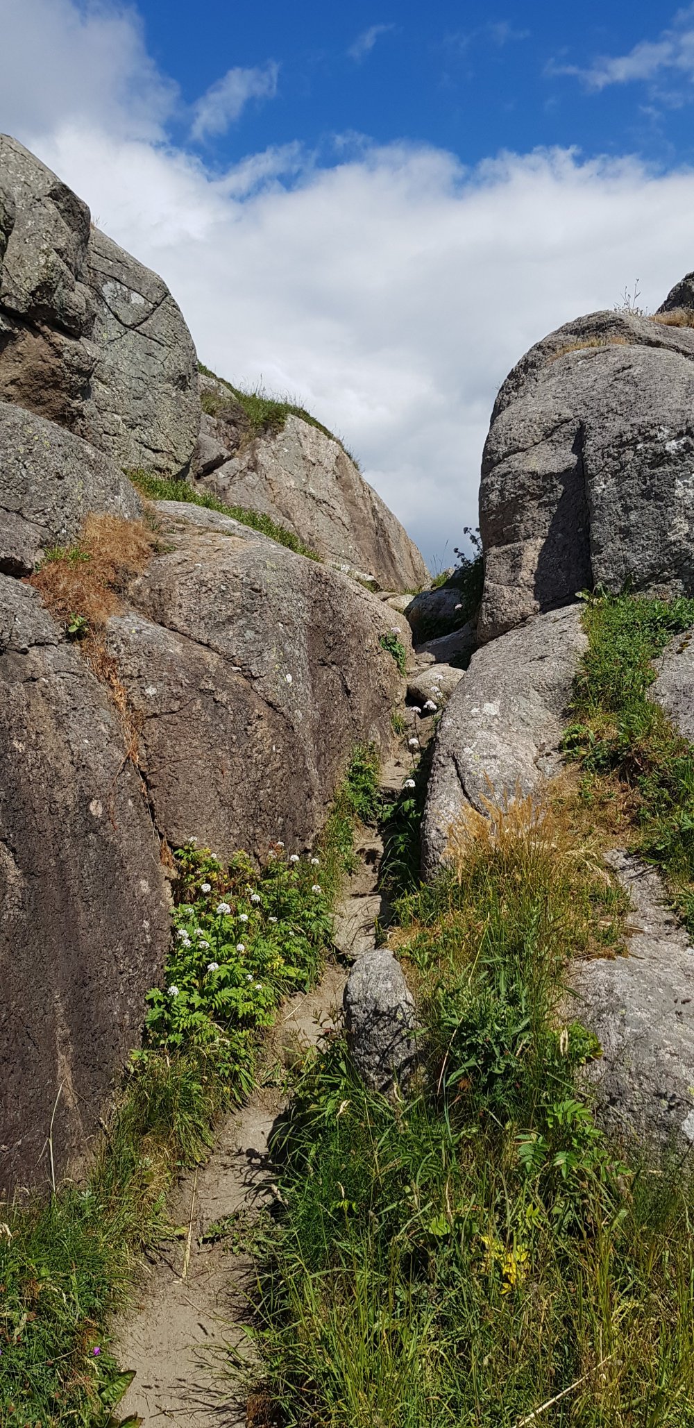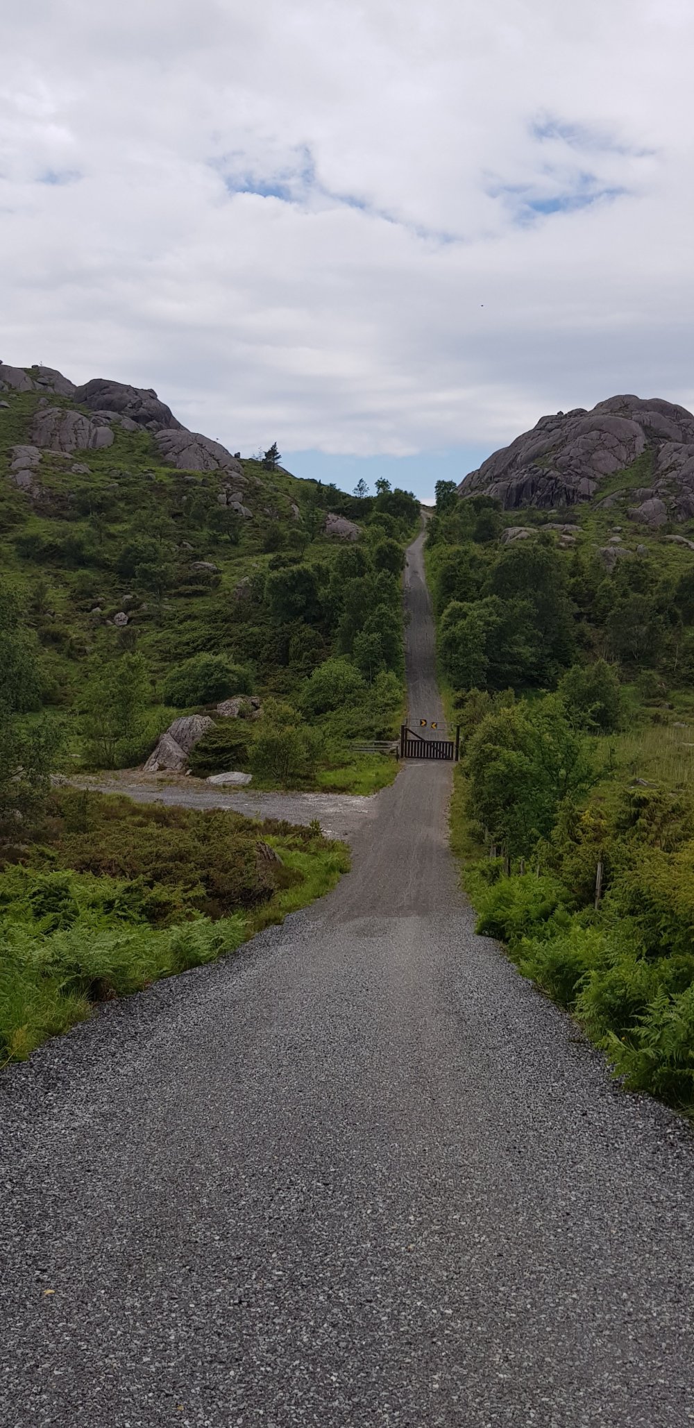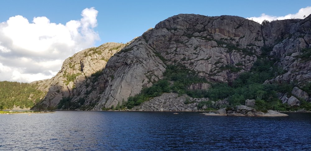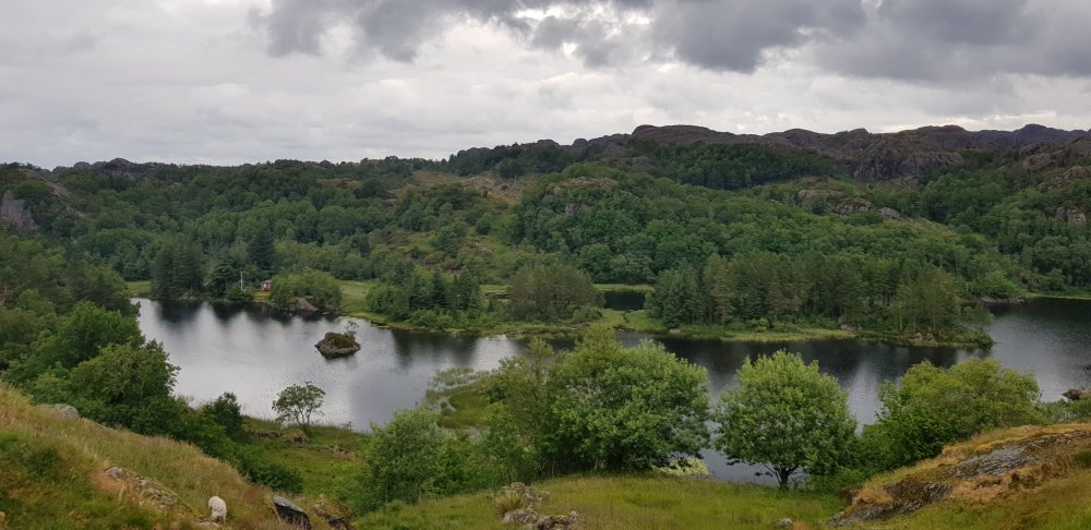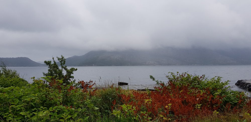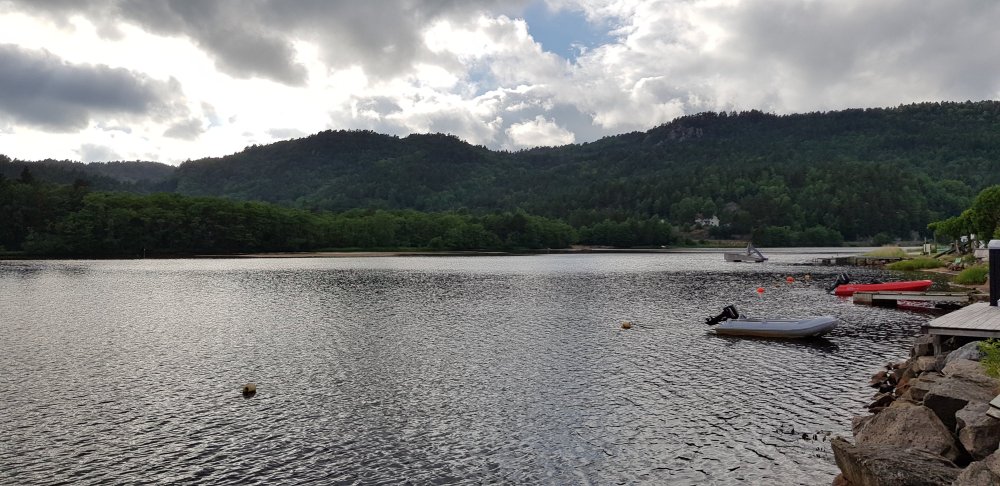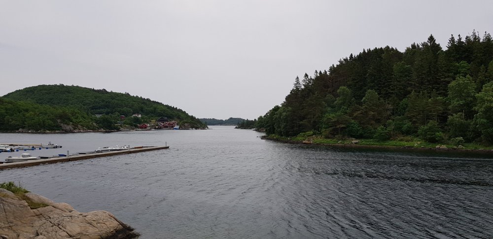 Morgens ist es zwar bedeckt, aber es regnet immerhin nicht, also kann ich mich zu meiner gewohnten Zeit auf den Weg machen. Zunächst geht es durch einen wunderschönen Ort namens Hauge, direkt am Wasser. Auf der Straße ist außer mir auch keiner unterwegs. Ob das damit zu tun hat, dass heute Sonntag ist? Bis Egersund sind noch ein paar Steigungen zu bewältigen, nun regnet es doch, sodass ich meine Pause in einer Bushaltestelle verbringe. Der Klassiker, der ja bei keiner Radtour fehlen darf. Einen offenen Supermarkt suche ich heute vergebens und erfahre auch in einem Kiosk, dass ich in dieser Gegend keinen finden werde. Aber in einer Tankstelle kann ich mich auch mit weiterem Proviant eindecken, bevor es auf den zweiten Teil meiner heutigen Etappe geht. Ein letzter knackiger Anstieg steht heute noch an und zwar auf der alten Poststraße, die durch Schotterbelag und stetigem auf und ab nicht immer reines Fahrvergnügen bedeutet. Auch hier bin ich komplett allein, weit und breit niemand zu sehen. Die Landschaft hier ist bestonders schön und bei jedem Anstieg wird man mit grandiosen Aussichten belohnt. Nur die Abfahrten lassen sich nicht immer genießen, was zum einen an der schlechten Qualität der Strecke liegt oder an Toren für die Schafe, die man erst öffnen muss, da kann man nicht laufen lassen. Aber es sind die allerletzten Höhenmeter in Norwegen für mich und nun kann ich es langsam ausklingen lassen. Noch ahne ich nicht, dass der heutige Tag noch eine unerwartete Anstrengung als Überraschung für mich hat. Laut meinem Track geht es nun links und somit wieder ans Meer, stimmt auch mit meiner Karte überein. Der Weg wird immer enger und als eine enge Felspassage kommt, entscheide ich mich nach einem Versuch umzudrehen. Mit Gepäck und bei den stufigen Steigungen hier kommt man nicht durch. Mir kommen ein paar Spaziergänger entgegen, die mir Mut machen, es wäre hier nur die eine Passage, danach wird der Weg besser. Die Frau hilft mir sogar noch, das Rad ohne Gepäck über die Felsen zu tragen. Nach weiteren 300 Metern folgt eine ähnliche Stelle, wenn das ein Radweg sein soll, dann weiß ich auch nicht. Also doch umdrehen, und jetzt muss ich mein Rad allein über die felsige Stelle bekommen, bergauf, allein und nach einer Etappe in den Beinen. Ich schimpfe laut und wie ein Rohrspatz, wobei ich noch kraftvollere Ausdrücke benutze, aber es hilft ja nix. Ich muss hier irgendwie durch und nachdem sich das Rad in den Felsen einige Male verkantet hat, schaffe ich es irgendwann und kann mich auf den Weg zurück machen. Erst bei der nächsten Abzweigung bin ich auf dem richtigen Weg und der Track war eindeutig falsch. Geschieht mir ein wenig Recht, dass passiert eben, wenn man auch ganz blind auf die Technik verlässt. Auch für die kommende Nacht ist wieder Regen angesagt, doch der erste Campingplatz möchte einen für mich zu stolzen Betrag für eine Hütte haben, da nehme ich einfach den nächsten, der dann auch wesentlich günstiger ist. Abends lässt sich dann noch die Sonne blicken, bevor in der Nacht der Regen kommt.
