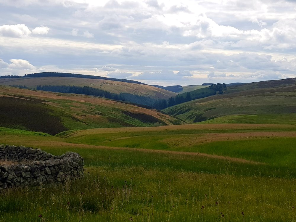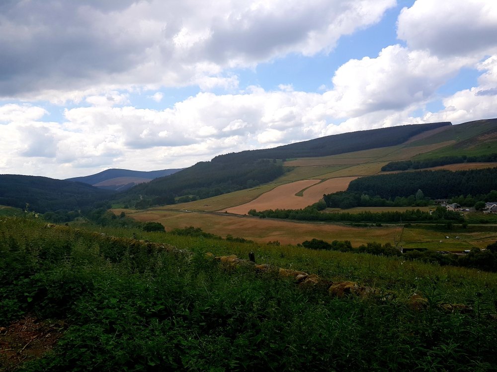 Heute steht ein entspannter Tag an, beginnend mit einem herrlichen Frühstück samt leckerem Rührei von heimischen Hühnern und einer netten Frühstücksunterhaltung mit meinen Gastgebern. Es ist schon warm als ich mich gegen 9 Uhr auf den Weg mache. Dafür lasse ich mir heute richtig viel Zeit. Es geht auf ruhigen Straßen durch die Felder. Einmal hält sogar eine Frau im Auto an, um mich zu befragen, was ich denn vorhabe. Es ist ein sehr nettes Gespräch. Und kurz darauf treffe ich noch auf einen Radler aus England, der ebenfalls für einen Plausch stoppt. Meine erste Pause mit Kaffee habe ich für Newton St. Boswells im Visier, aber ehe ich es mich versehe bin ich schon durch den Ort gefahren. Zum Glück ist der nächste Ort nicht weit entfernt und zum Kaffee gibt es in Melrose noch ein leckeres Shortbread, Zuckerschock inklusive. Sehr träge hab ich nun kaum noch Lust weiterzufahren und bummel mich so durch die Strecke. In Galashields verpasse ich einen Abzweig und muss nun die Route ein wenig umändern. Was auch immer der Grund ist, mehr als einen Kilometer zurückzufahren kommt für mich nicht in Frage, allein der bloße Gedanke tut schon weh. Um mich herum tauchen mehr und mehr Berge auf, so langsam wird es so, wie ich mit Schottland vorgestellt habe. Meine Umleitung funktioniert zumindest, es geht auf und ab und ich erreiche bald meinen heutigen Zielort, wo ich auf dem Campingplatz unterkomme. Den Campingwart verstehe ich nur mit mehrmaliger Nachfrage. Heute hat England gespielt, als ich zum Sieg gratulieren möchte, werde ich abschätzig gemustert, ok, das Verhältnis ist eindeutig klar, die Schotten mögen keine Engländer. Zu meiner Frage nach „Wifi“ bekomme ich eine Antwort, die ich auf Anhieb verstehe. „No, but I have a wife!“