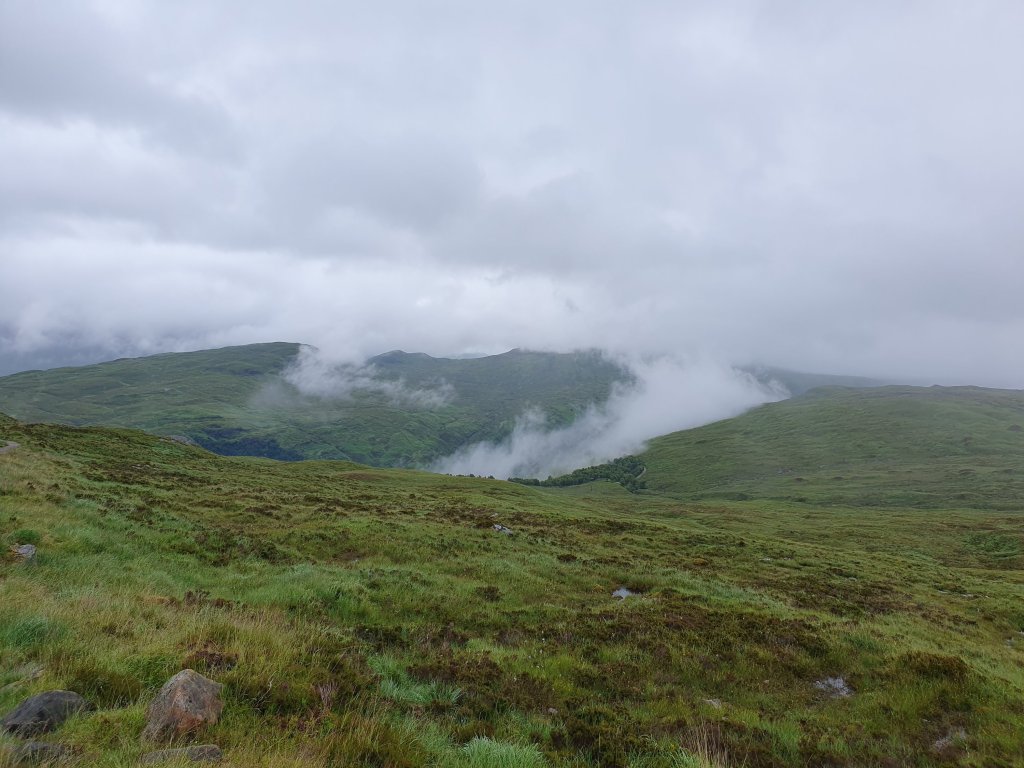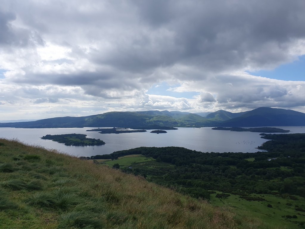 Schon als ich meine Haustür in Berlin verlasse, gibt es einen Vorgeschmack auf das, was mich die nächsten Tage in Schottland erwartet: sehr viel kühles Nass von oben. Da mein Flug von Frankfurt aus geht, reise ich einen Tag früher an, übernachte in der Nähe des Flughafens und kann mich am nächsten Morgen entspannt auf dem Weg machen. Für den Flug habe ich einen Fensterplatz und genieße die Aussicht. Meine Nachbarin rutscht immer mal wieder näher und versucht auch einen Blick aus den Fenster zu erspähen. Beim Kaffee kommen wir ins Gespräch und schnell stellt sich heraus, dass auch sie die Wanderreise bei Wikinger gebucht hat. Zusammen bestreiten wir den weiteren Weg: ankommen, Passkontrolle, Gepäck abholen und Ausschau nach einem Wikinger-Schild halten, was ein junger Reiseleiter bereithält. 10 weitere Mitstreiter sind bereits da. Geld benötig man nicht, so Juri, unser Reiseleiter, da man alles mit Karte zahlen könne. So lasse ich den Geldautomaten links liegen. Mit einem kurzen Transfer geht es dann ins Hotel, wo wir bereits am frühen Nachmittag eintreffen. Juri eröffnet uns, dass wir heute bei dem schönen Wetter noch den ersten Hügel erklimmen, da für morgen schlechteres Wetter angesagt ist. Nach einer Vorstellungsrunde stärken wir uns mit Pommes und Pizza, können dann unsere Zimmer beziehen und treffen uns anschließend zum ersten Aufstieg zum Conic Hill. Es ist warm und einigen macht der Aufstieg zu schaffen. Die Aussicht über das Loch Lomond ist grandios und wir können uns bereits eine Übersicht über den Weg der nächsten zwei Tage machen. Abends erwartet uns ein sehr reichhaltiges Abendessen mit drei Gängen. Auch wenn einige aus der Gruppe wirklich tapfer alles aufessen, wird es nicht für Sonnenschein am nächsten Tag reichen.