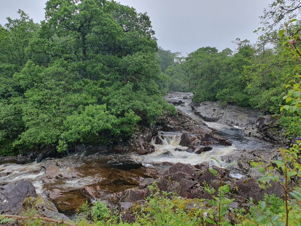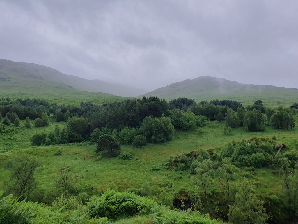 Heute starten wir bereits im Regen. Heute kann man wirklich mal die Qualität seiner Ausrüstung überprüfen. Mein Fazit fällt schnell aus: Verbesserungswürdig. Meine Regenjacke hat wohl die besten Zeiten hinter sich, obwohl ich sie vor der Abreise nochmal frisch imprägniert hatte. Die Mittagspause können wir immerhin bei einem kurzen Regenstopp einlegen, doch kaum wandern wir weiter, geht es wieder los. Heute wandern wir immerhin viel im schützenden Wald. Ich merke nach den ersten 15 Kilometer jedoch leider meine Füße, die musste ja gestern schon einiges an Weg zurücklegen und haben keine rechte Lust mehr. Doch irgendwann spricht Juri das ersehnte: „in weniger als einer Stunde sind wir da“. Das letzte Stück ist auch landschaftlich nochmal sehr schön, inmitten von Heidebüschen wandern wir zu unserer nächsten Unterkunft nach Tyndrum, wo wir alle durchnässt ankommen und den Trockenraum in Beschlag nehmen, bevor wir es eine gut tuende heiße Dusche gibt.