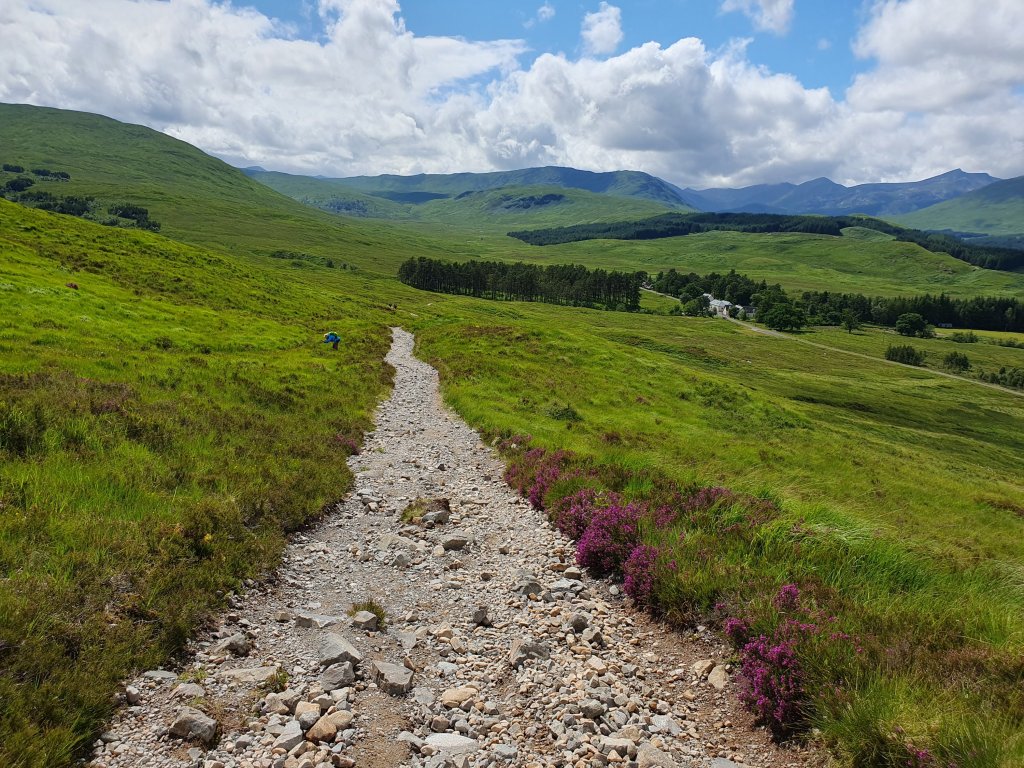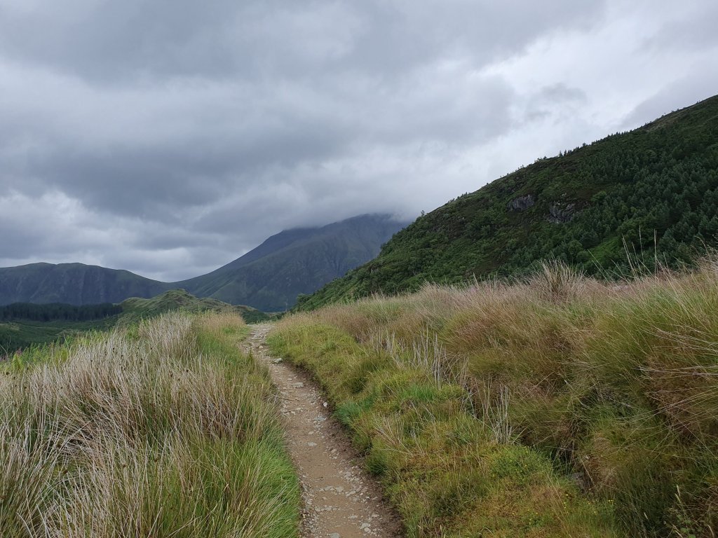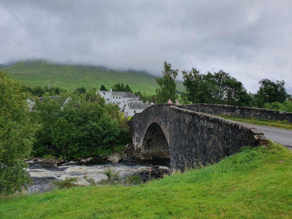 Heute steht eine kürzere Etappe an und ich teste meine zweite Jacke. Doch der Regen ist gnädig und nieselt eher vor sich hin. Nach 10 Kilometern können wir an der Bridge of Orchy für eine Runde sehr leckere Scones einkehren. Und das Wetter meint es gut mit uns, mehr und mehr reißt der Himmel auf und wir können uns gar nicht sattsehen und genießen jeden Kilometer.