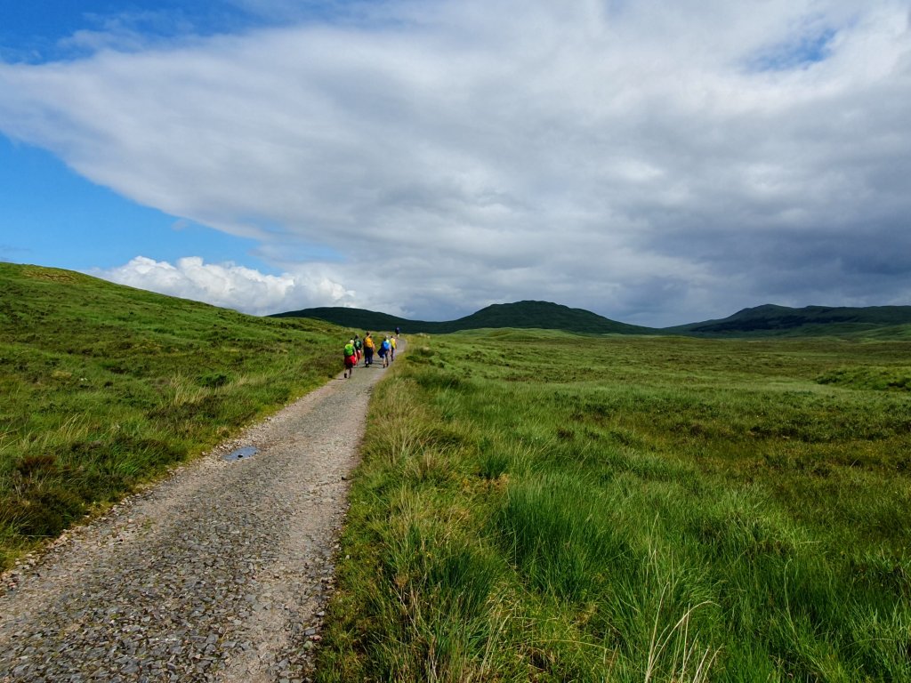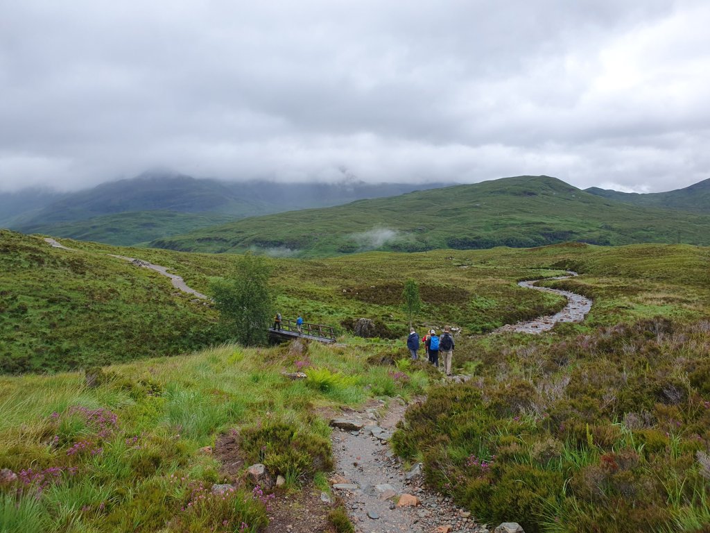 Durch den letzten Abend haben wir „unseren“ Kellner ins Herz geschlossen, aber ich kann ihn leider nicht überzeugen, mitzukommen. Heute zeigt sich das Wetter gnädig, der Weg ist steiniger und dann wandern wir inmitten der Highlands, alle sind still und genießen den Weg. Nachdem der Gipfel erreicht ist, machen wir Pause. Auf dem Abstieg kommen weitere imposante Berge in Sicht. Im Kingshouse legen wir eine Kaffeepause ein und wir entscheiden uns, noch die nächsten 4 Kilometer zu wandern, die eigentlich zum nächsten Tag gehören. Jede trockene Minute sollte genutzt werden.