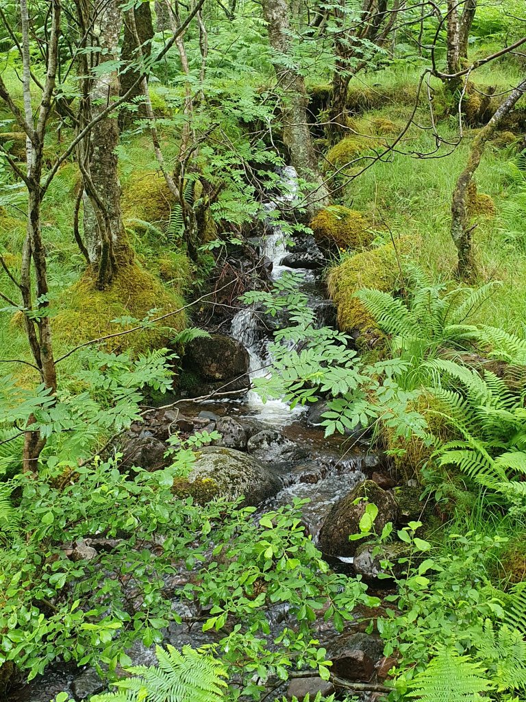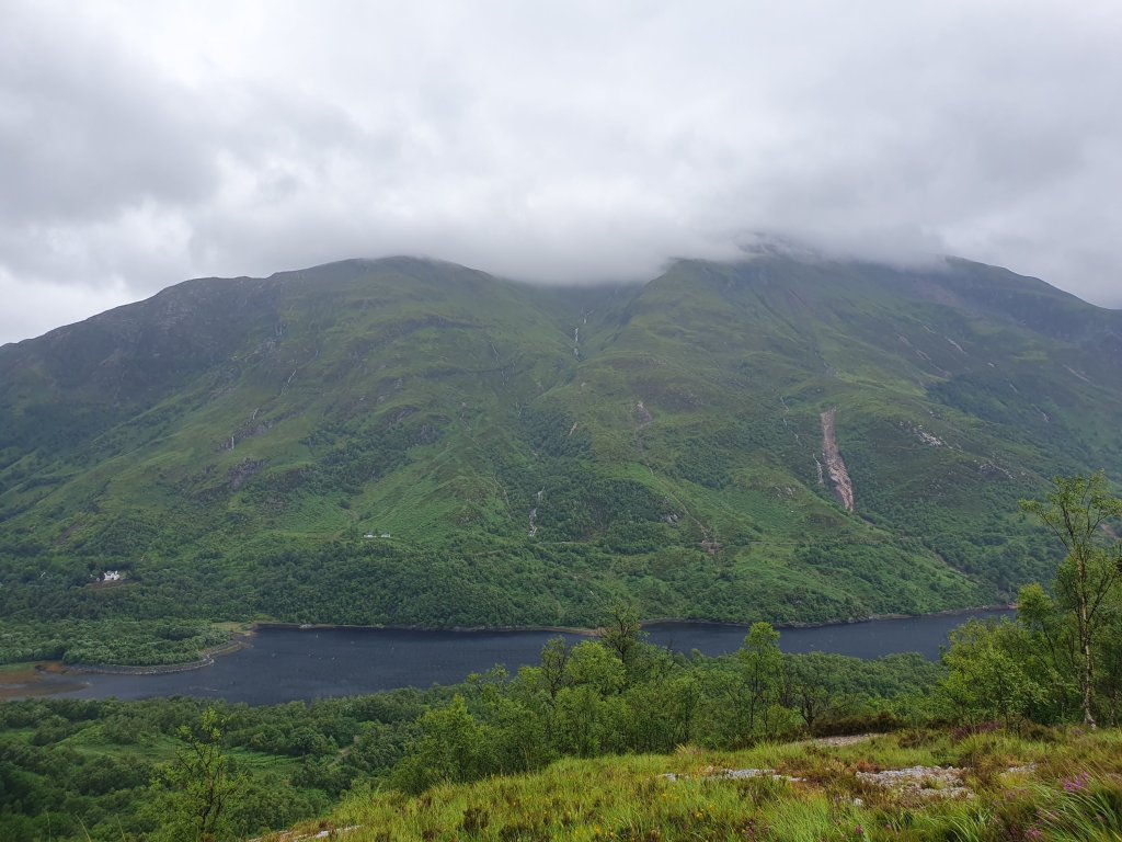 Gestern haben wir bereits Bekanntschaft mit den ersten Midges gemacht, winzig kleine Mücken. Mein Fliegennetz für den Kopf, was ich mir für die Radtour 2018 gekauft hatte, kommt nun doch endlich zum Einsatz. Alle anderen aus der Gruppe kaufen sich im anliegenden Laden noch Netze um im Gesicht Ruhe vor den Plagegeistern zu haben. Das Wetter ist noch trocken, als wir nach einem stilechten britischen Frühstück loswandern. Bei der ersten Pause springt unser Reiseleiter Juri in die Fluten des Loch Lomond. Die Gruppe hingegen taucht ihre Köpfe in die frisch erworbenen Netze. Nach der Pause lässt der Regen nicht lang auf sich warten, wir stapfen durch Eichen- und Kieferwälder inmitten von wunderschöner grüner Landschaft. Schon bald sind wir am Ziel angekommen, laut Juri ist es heute ja auch „nur“ ein Spaziergang. – „Ganz entspannt“. Relativ durchgenässt können wir am Ende der Etappe in einem Pub einkehren, bevor uns der Transfer zum Hotel zurückbringt.